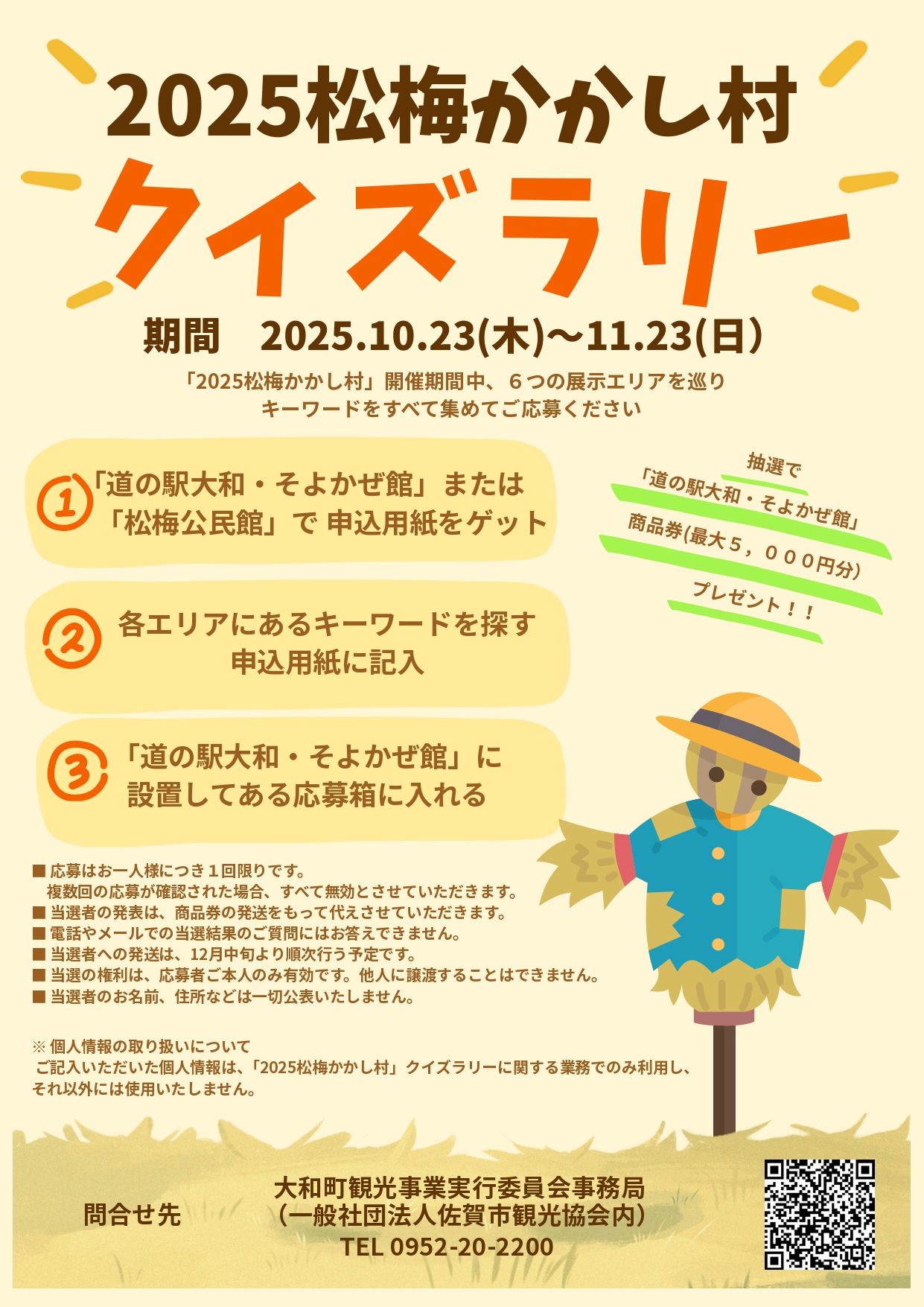 ご記入いただいた個人情報は、「2025松梅かかし村」クイズラリーに関する業務でのみ利用し、それ以外には使用いたしません。