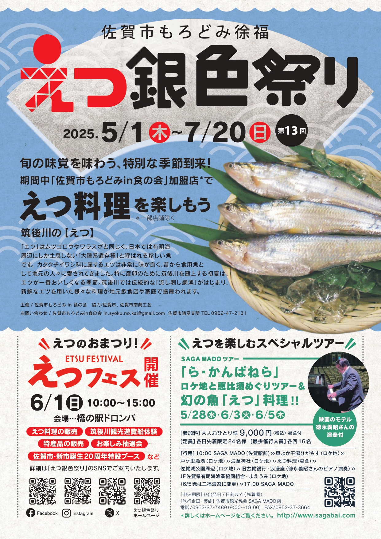 「佐賀市もろどみ徐福えつ銀色祭り」は5/1~7/20まで筑後川のエツ漁期間に合わせて実施。