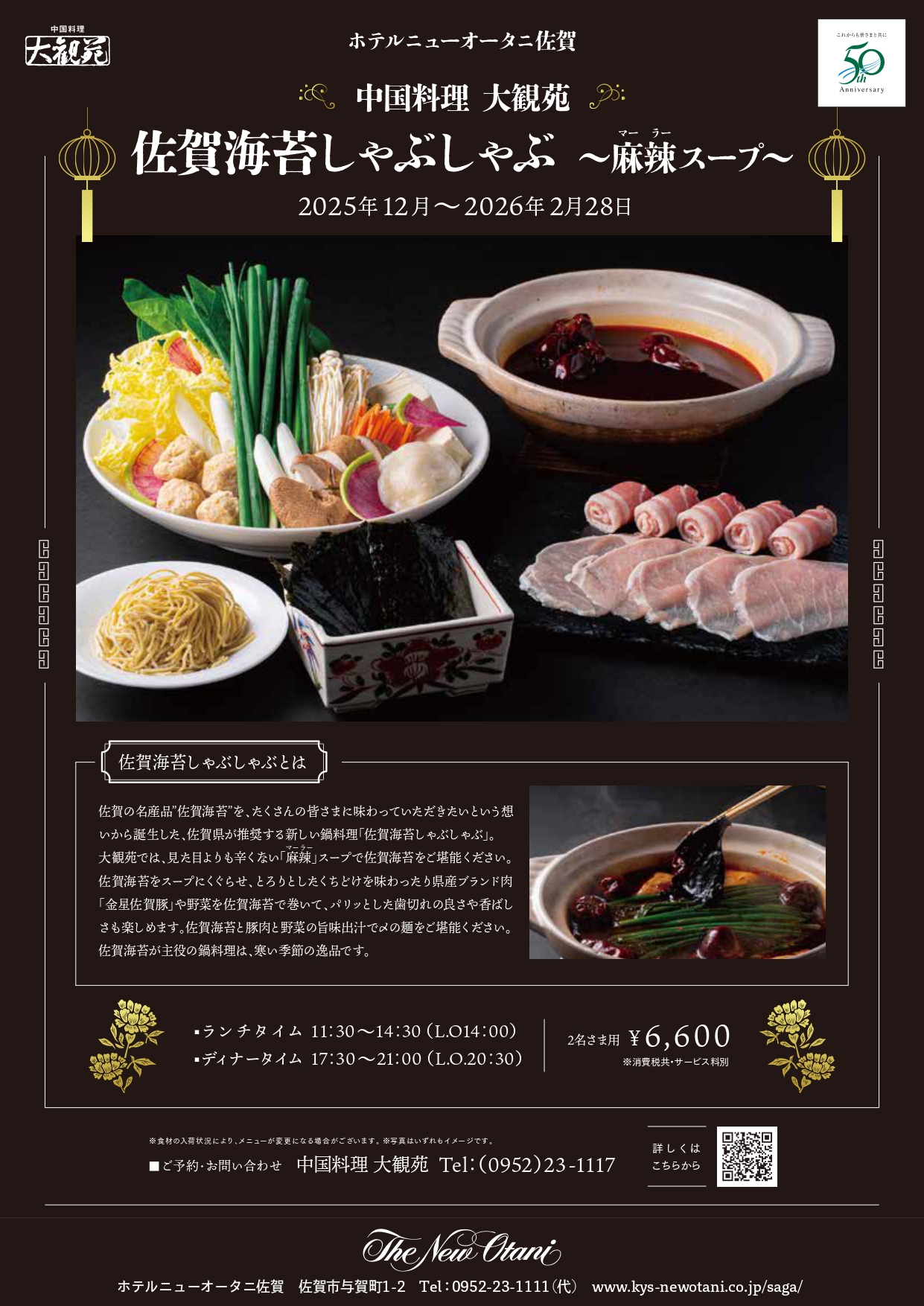 大観苑では、見た目よりも辛くない「麻辣」スープで佐賀海苔をご堪能ください。