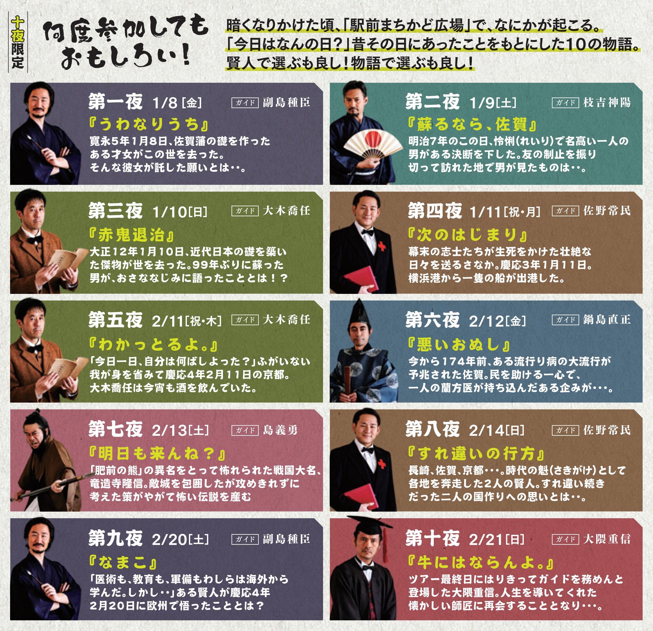 ガイド役として「幕末・維新 佐賀の八賢人おもてなし隊」が毎晩日替わりで登場します。その日だけしか楽しめない10の物語をぜひお楽しみください。