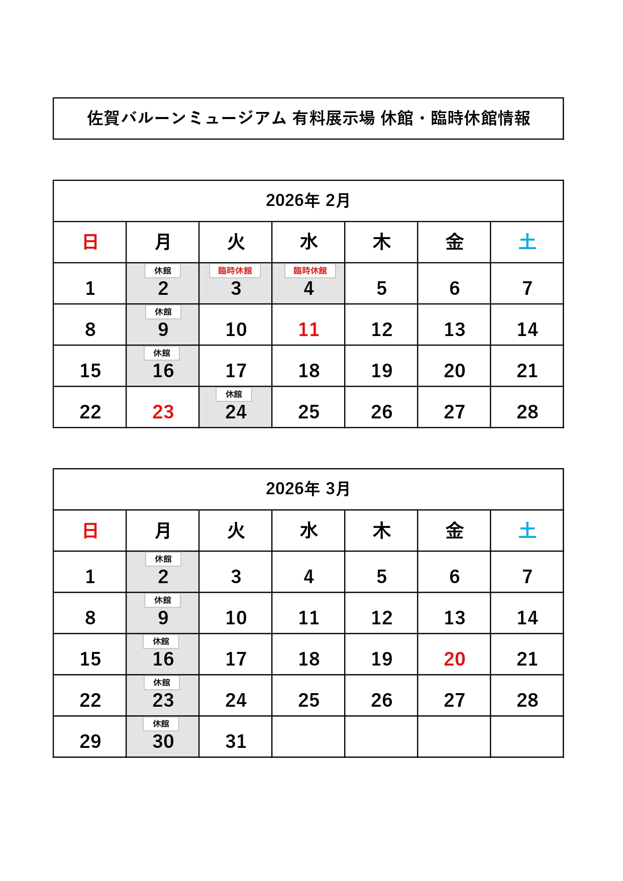 2026年2月、3月の佐賀バルーンミュージアム有料展示場の休館及び臨時休館についてお知らせいたします。