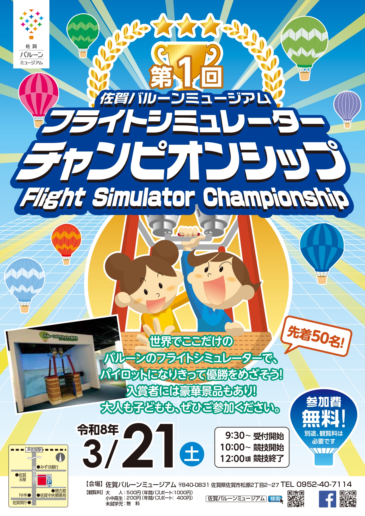記念すべき第1回!世界でここにしかないバルーンのフライトシミュレーターを使って、実際の競技さながらにパイロットになりきって優勝をめざそう!入賞者には、豪華景品もあります。大人も子どもも、ぜひご参加ください!