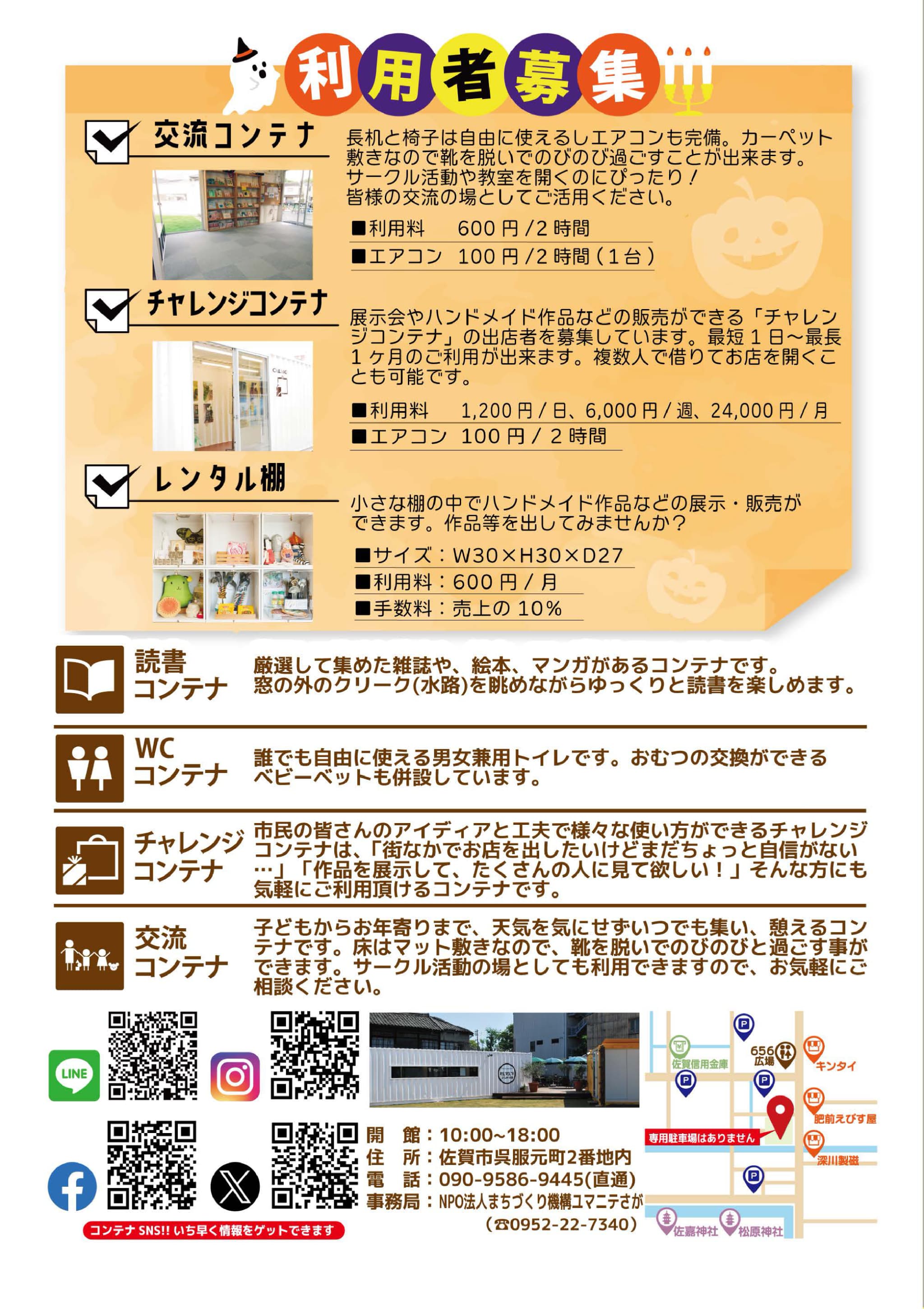 わいわい!!コンテナ2 090-9586-9445(直通) 【事務局】 NPO法人まちづくり機構ユマニテさが 0952-22-7340
