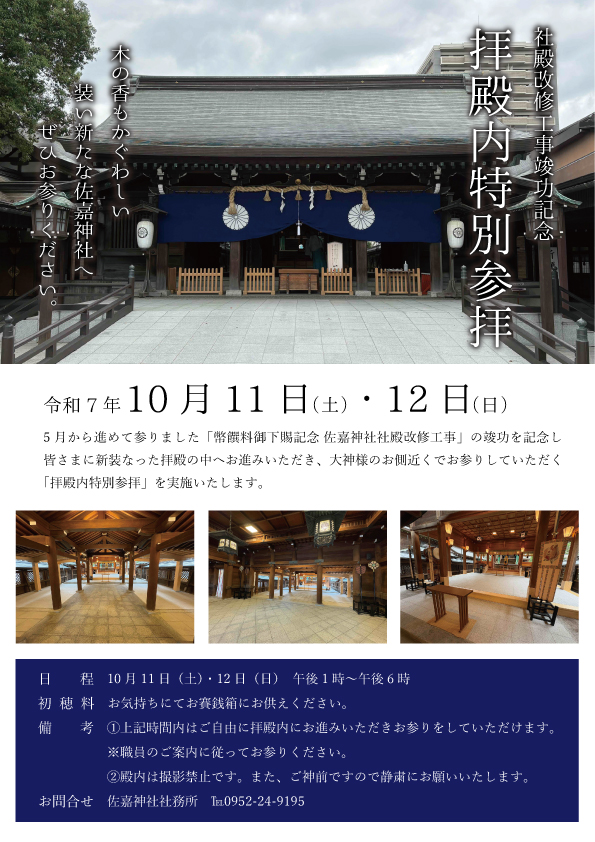 これを記念し、皆さまに新装なった拝殿の中へお進みいただき、大神様のお側近くでお参りして頂く「拝殿内特別参拝」を下記の通り実施いたします。