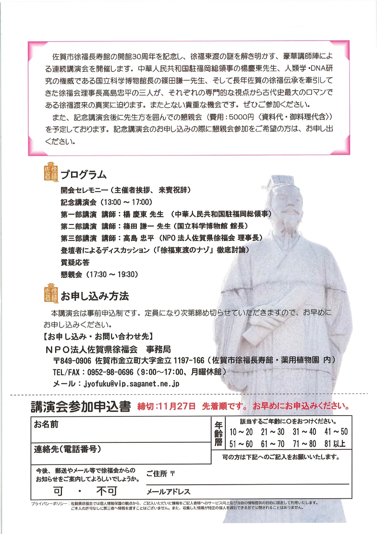 佐賀市徐福長寿館の開館30周年を記念し、徐福東渡の謎を解き明かす豪華講師陣による連続講演会を開催します。