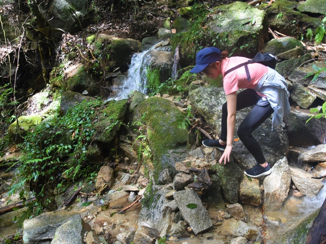 長い山道をひたすら登り、ようやく第一巨石を発見いたしました!! これは、神様の頭の形に似ていることから「神頭石」と言うそうです。 身長154.8センチの私と比べて見てみてください。この大きさは一目瞭然ですね。