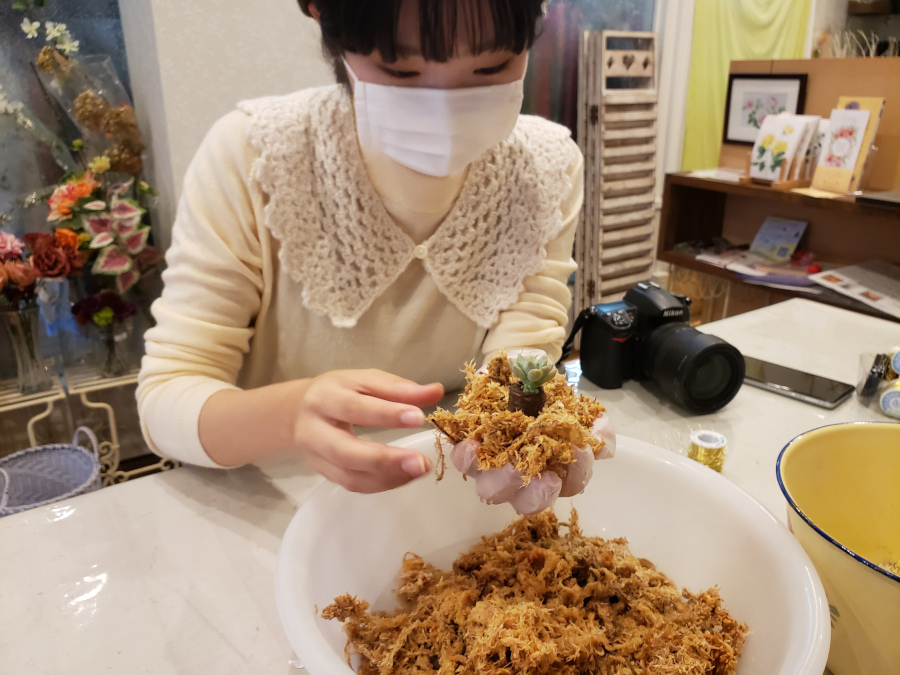 ![]() こちらのフルールドソレイユさんは 佐賀市のお店18店舗でお店の方が講師となってプロならではの知識、技術を教えていただける「まちゼミ」の中の1店舗になってます! ということで! この日は、 「多肉植物でミニ苔玉を作ろう!」(¥800)を体験させていただきました! コロコロしていてかわいい… 今私の部屋にはサボテンが1つあるのですがちょうど寂しく感じていたところで、 サボテンの仲間を作るために! いざ! ![]() まずは、重冨先生のお手本を! ![]() そして…ゴム手袋をつけます!! の顔です! ![]() 好みの多肉植物を選びます!! ![]() 私は根元に子供がいる子を選びました! うまく行ったらたくさん生えてくるみたいです! ![]() まず、水苔に水を含ませて 手のひらに収まるくらいをぎゅっと絞ります! (百武は大きめにしました!) ![]() そして、平たくして、中心に砂利を入れて、 ![]() そして、先ほど選んだ多肉植物を真ん中に設置! 包む!!! これが意外と難しかったです。 多肉植物かゆらゆらとして茎のところを包むのに苦戦します! ![]() そして針金を巻いていきます!! これで苔玉本体は完成です! ![]() 次は、苔玉を置くための土台をこの針金を使って作っていきます! ![]() これはもうグニャングニャンです、 何かの形を狙っているわけではありません、 行き当たりばったりです 笑 ![]() ある程度形ができたら、 苔玉を置いてみて、バランスの調節をします! ![]() すると! 完成です! とっても簡単でした!! なのに! まるっこくて、コロコロしててかわいい! ![]() お世話はカラカラになった頃にこんな感じでお水を吸わせてあげたらいいそうです! むしろ、あげすぎはNGだそうです! 水やりを忘れがちな百武でもこのくらいならできる! ![]() ![]()