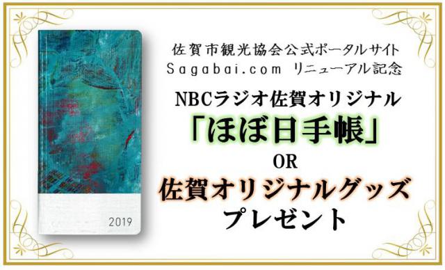 佐賀市観光協会では、佐賀市観光協会公式ポータルサイト「 Sagabai.com (さがばいどっとこむ)」のリニューアルを記念して、NBCラジオ佐賀オリジナル「ほぼ日手帳」を抽選で20名様に、「佐賀オリジナルグッズ」を同じく抽選で100名様にプレゼントいたします。
