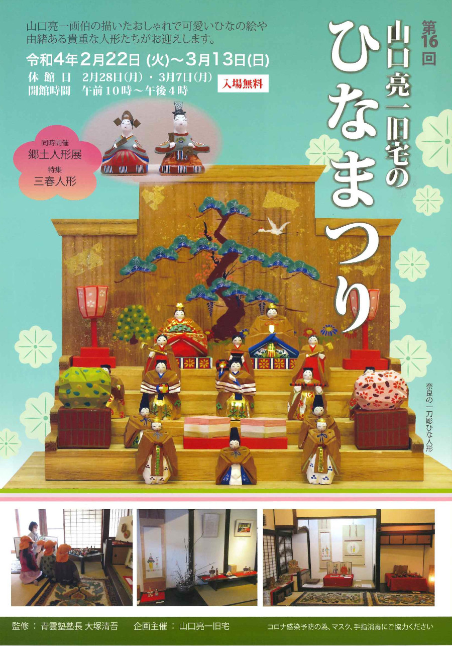 山口亮一画伯の描いたおしゃれで可愛いひなの絵や 由緒ある貴重な人形たちがお迎えします。 【同時開催】 郷土人形展 【特集】 三春人形