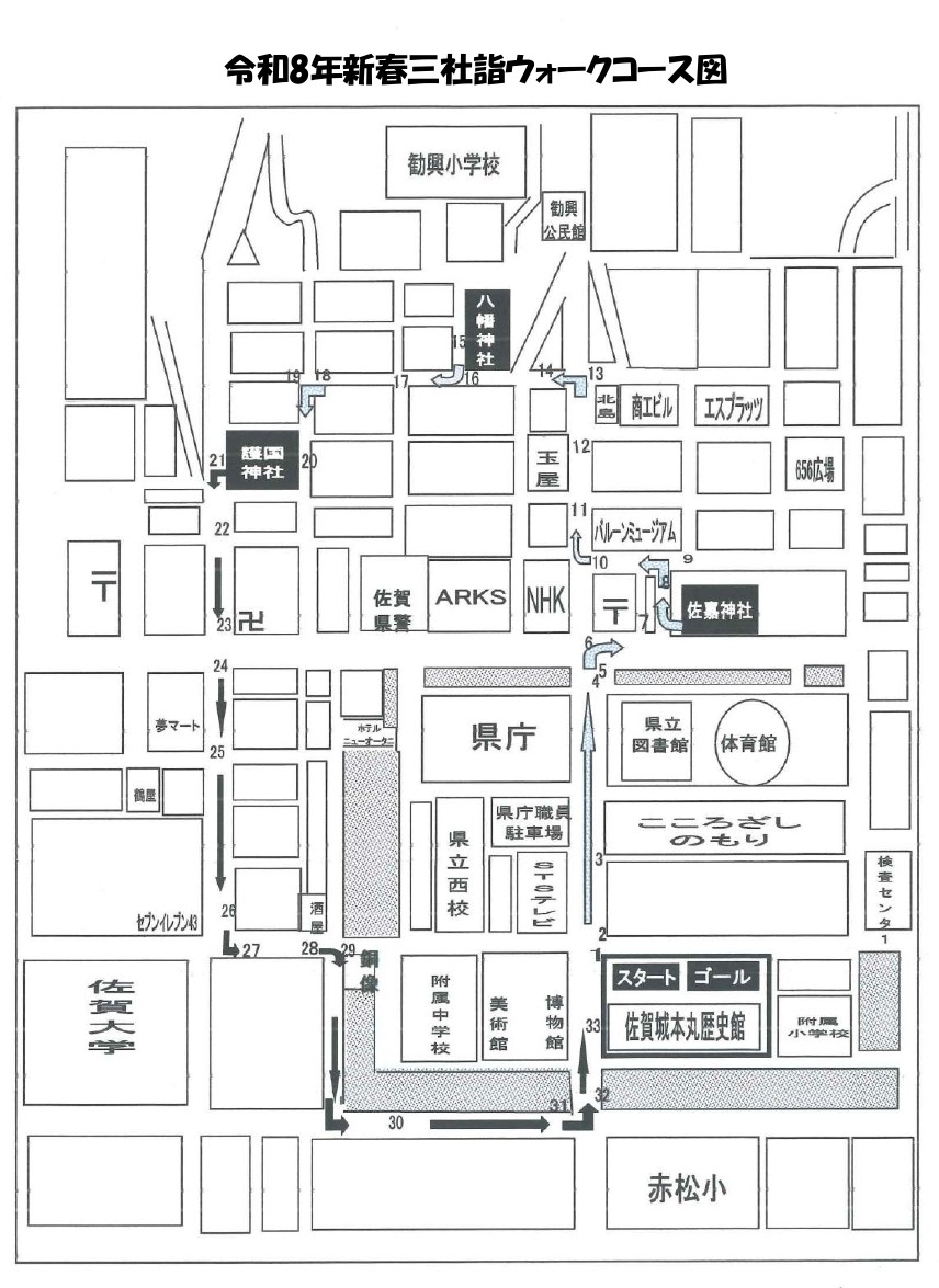 佐賀城本丸歴史館を出発して、佐嘉神社、八幡神社、護国神社を巡る5~6km程度のコースです。