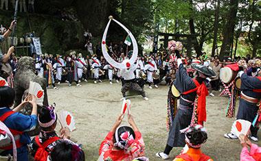 標高約400mにある市川地区に江戸時代から伝わる浮立。三日月をかたどって雲竜を描いた直径約1mの「テンツキ」と呼ばれる大きな前立を額に付け、腰にござを下げた踊り手が大太鼓を打ち、五穀豊穣と平和を祈って舞います。