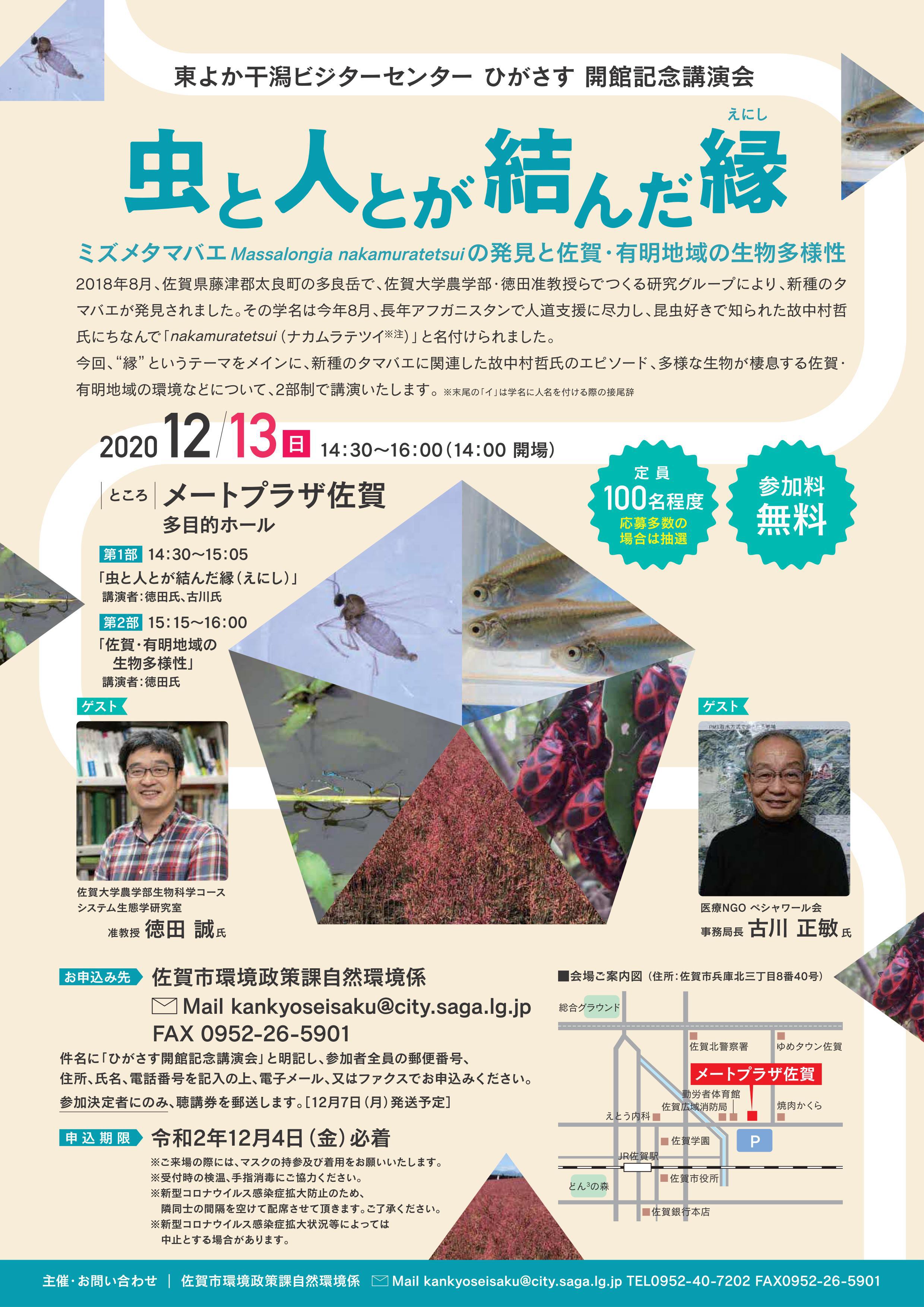 主に、佐賀・有明地域の生物多様性について、また、徳田准教授らでつくる研究グループが佐賀県藤津郡太良町の多良岳で発見した新種のタマバエの学名を、長年アフガニスタンで人道支援に尽力し、昆虫好きで知られた故中村哲氏にちなんで「nakamuratetsui(ナカムラテツイ)」と名付けたたこと等についての講演です。