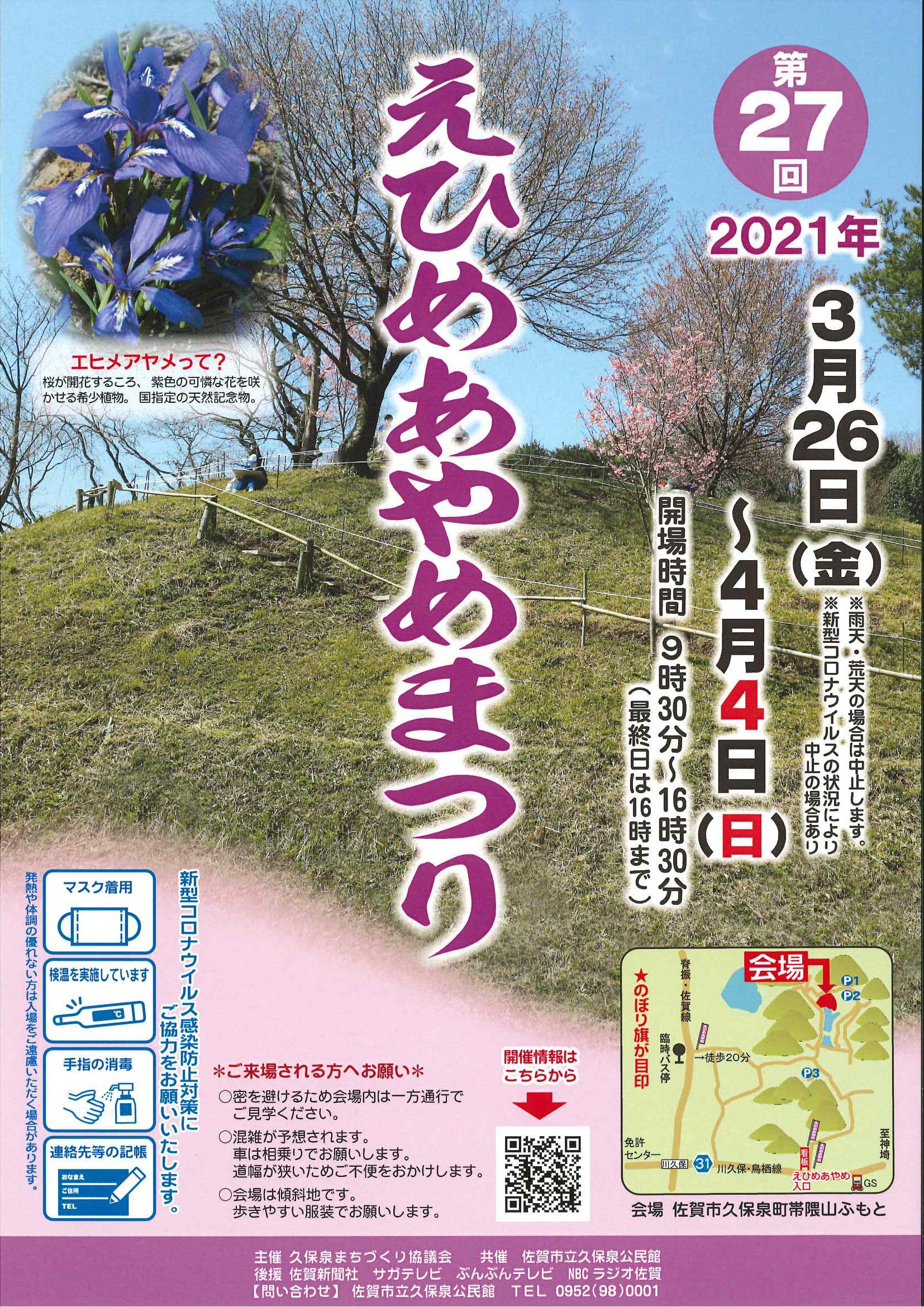 エヒメアヤメの自生地として国の天然記念物に指定されている佐賀市久保泉町の帯隈山を一般公開する「えひめあやめまつり」。まつりでは、ボランティアガイドによる解説やお茶の提供(セルフサービス)などがあります。
