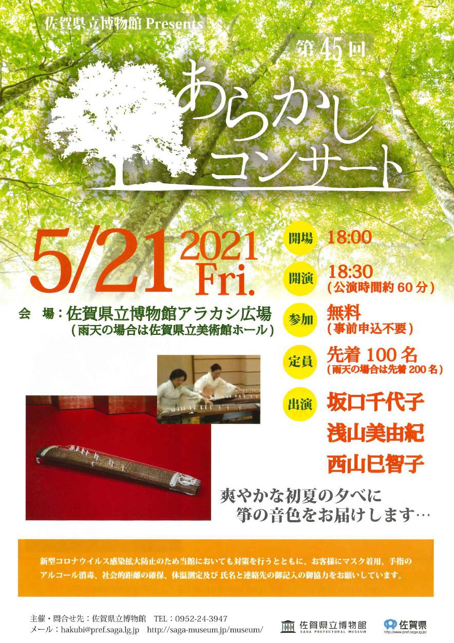 県立博物館では、佐賀城公園の自然や芸術作品に囲まれた豊かな環境で皆様に素敵な音楽を楽しんでもらうため、平成18年度から年に3回「あらかしコンサート」を開催しています。